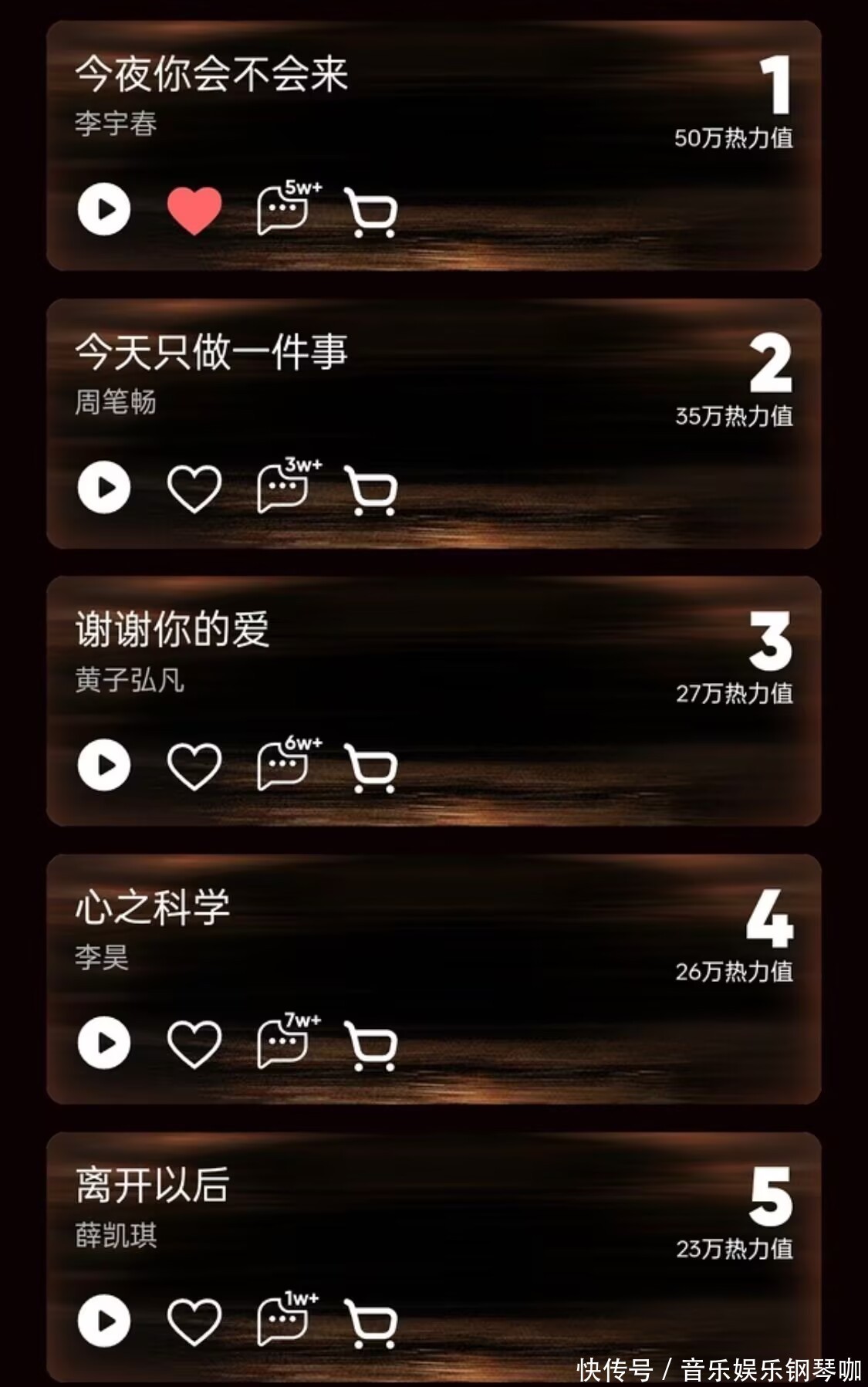 皇冠6686正网节目刚上线,有5首歌曲的音源数据排在前五名。