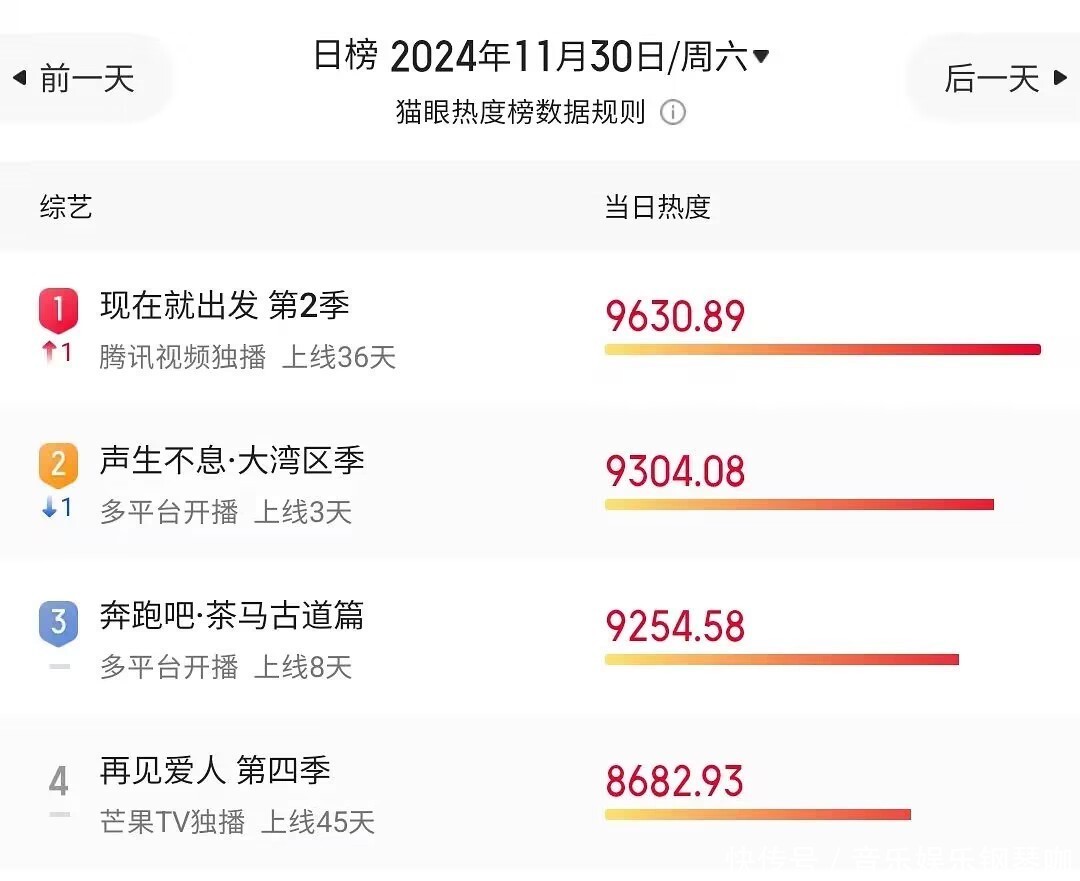在某平台统计的综艺热度榜指数内部,《当今就动身》占在第一,天然这档综艺节目亦然因为上线了好多天。